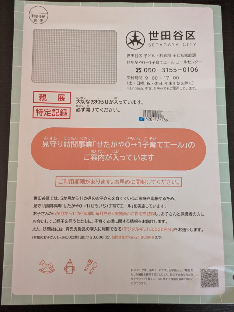 世田谷区で実施している見守り訪問事業「せたがや0→1子育てエール」の対象となるため