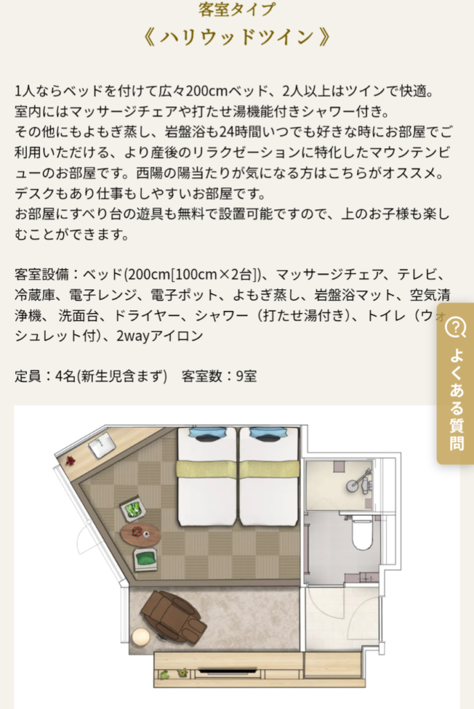 “産後のリラクゼーション寄り”の設備が特徴のお部屋だそうです。